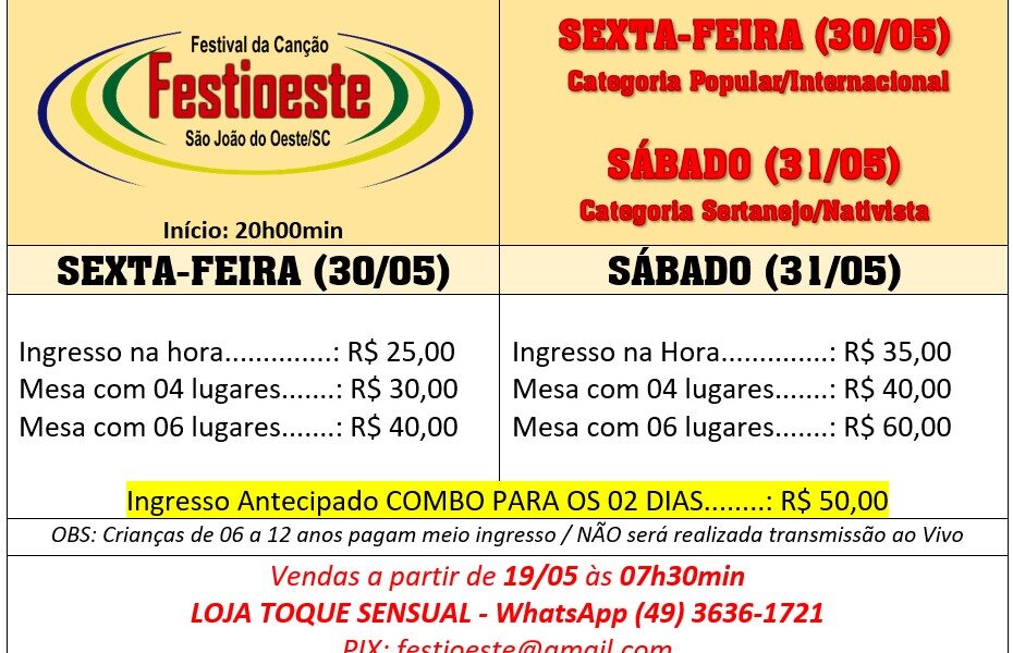 📍 Local: Sociedade Aliança – São João do Oeste/SC🗓️ Data: 30 e 31 de maio de 2025🕗 Início: 20h00min 🎶 PROGRAMAÇÃO:➡️ Sexta-feira (30/05): Categoria Popular/Internacional➡️ […]